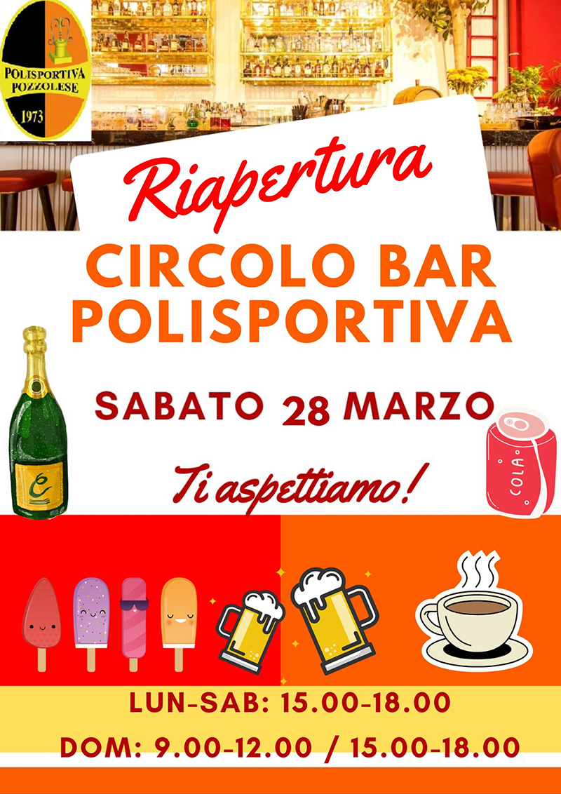 Dopo la pausa invernale, da sabato 28 marzo riapre il Circolo Bar nei pomeriggi dei giorni feriali e la domenica anche il mattino. Dal profumo del caffè al brindisi fresco del tramonto. Uno spazio per chi ama lo sport, per...
